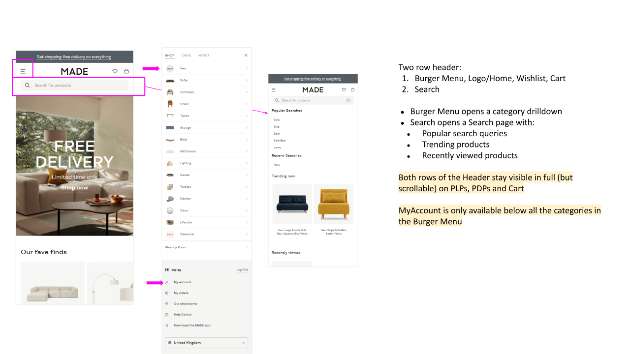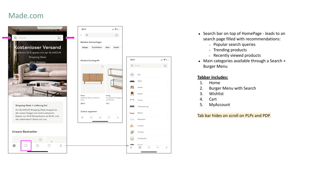 As part of the design team at Westwing, I contributed to extensive user research campaigns, user interface implementations, and A/B testing to identify and implement the best solutions for improving shop navigation.